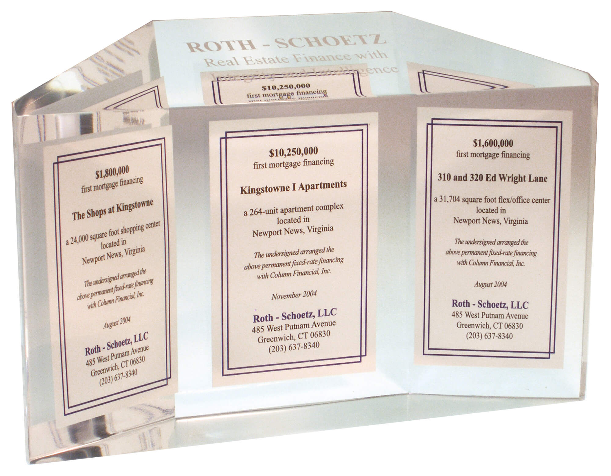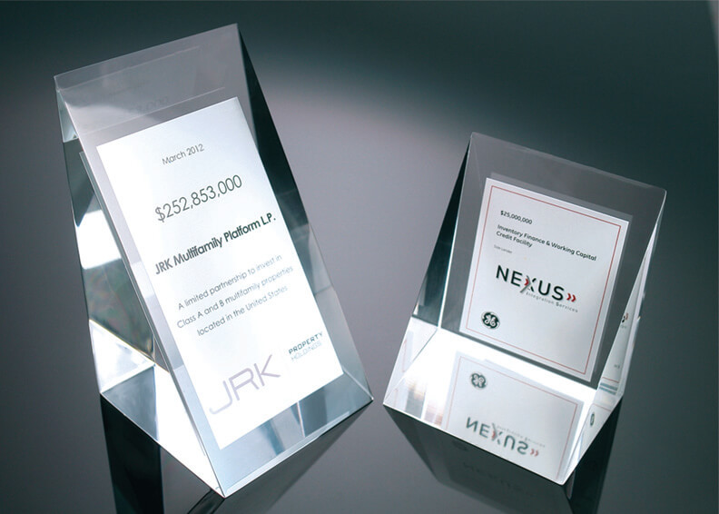 Lucitetombstones.com creates Custom & Unique Deal Toys, Awards, Plaques, and Gifts that are a great way to recognize and appreciate the hard work and dedication of your team or company or memorialize your transaction. Our ideas are endless. Financial Tombstones: Lucite deal toys and acrylic desk awards can be a great choice for recognition and gifts. Lucite is a durable and high-quality material that can give the deal toys a professional and sophisticated look. Acrylic desk awards are also a popular choice due to their clarity and versatility in design options. They can be customized with different shapes, colors, and engravings to match the recipient’s preferences and accomplishments. Both options offer a modern and sleek appearance, making them ideal for showcasing achievements in the financial industry.